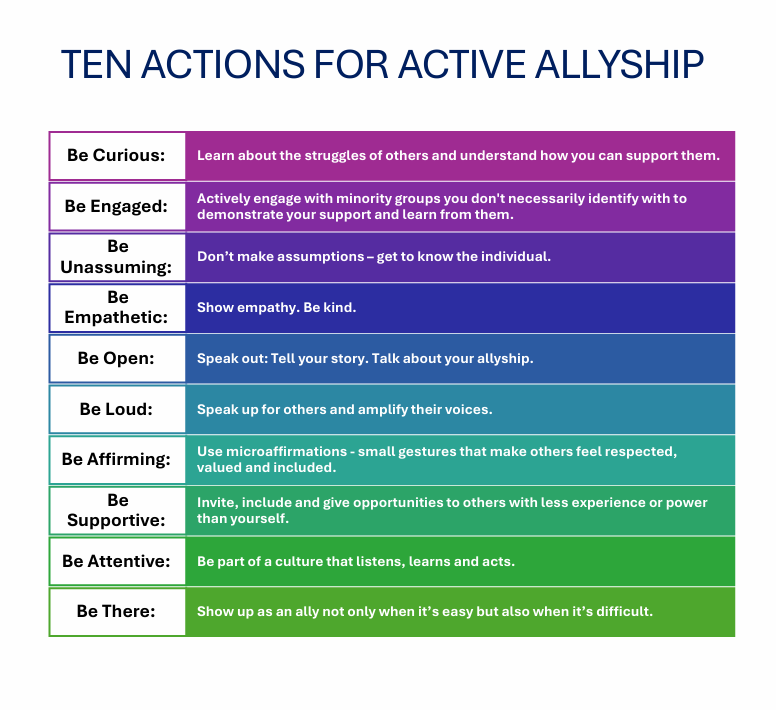 These “Ten Actions for Active Allyship” were derived following our successful, inter-community panel event ‘Active Allyship’, held on 9th July. During the event, our panel reflected on what we have learnt from our 2023-25 series of allyship events and our 2024 Allyship Guidelines, working towards identifying ten practical steps for being a good ally. The final “Ten Actions” are shown below: